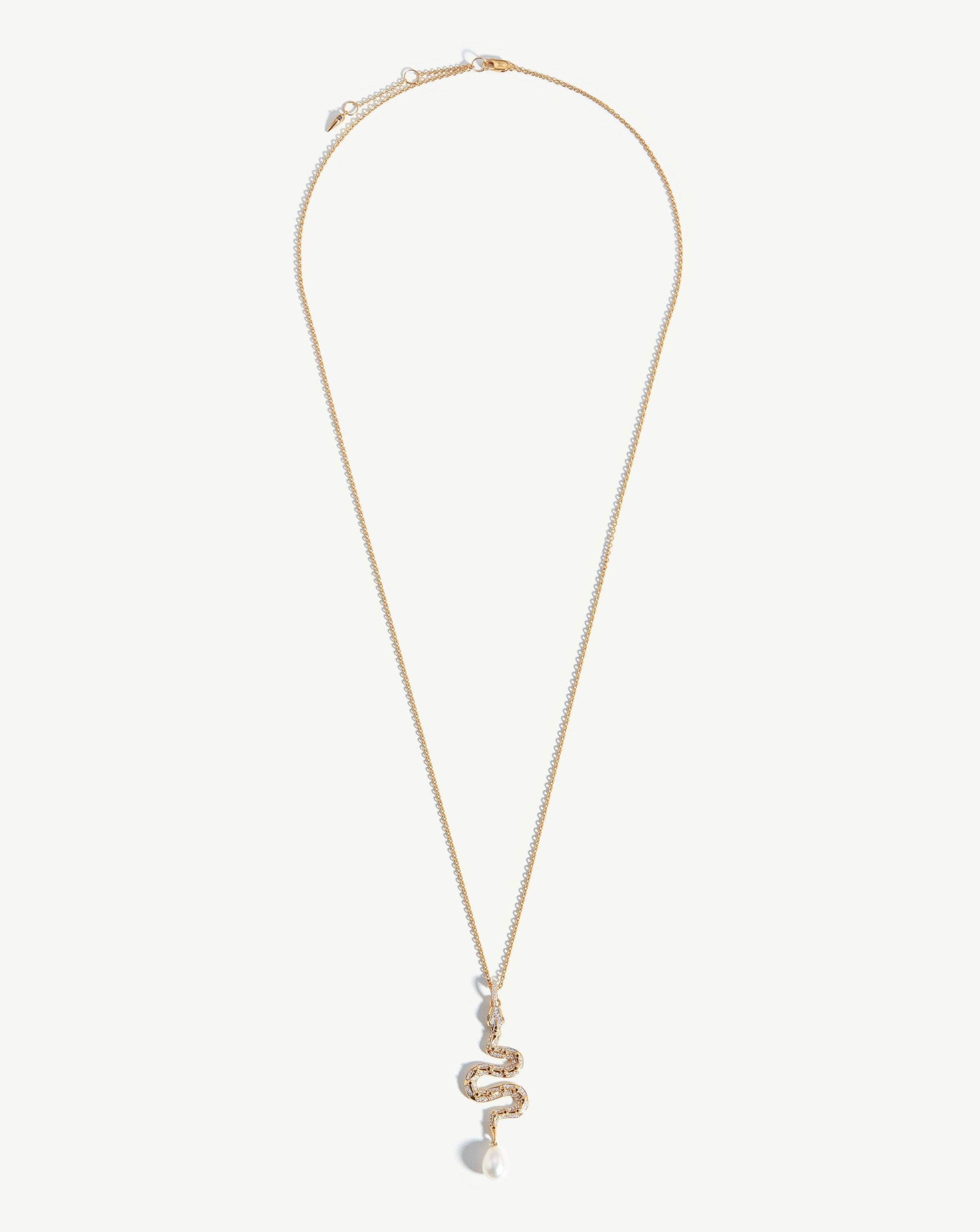 Shed your preconceptions with this opulent serpent pendant necklace. The scale detailing is embellished with white diamond pavé and inset black diamonds leading to a single baroque pearl drop. Paired with a delicate 14ct solid gold chain.