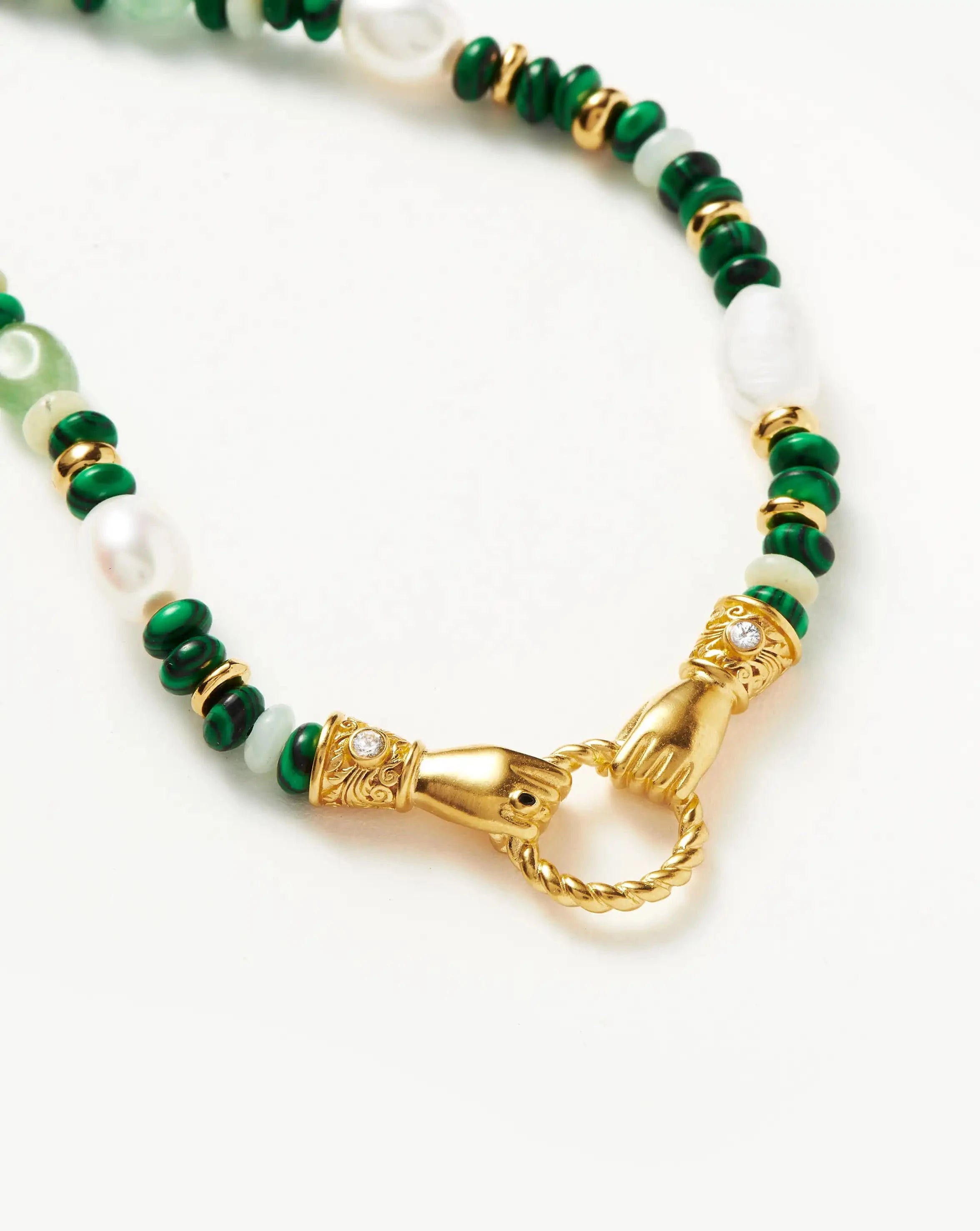 Harris Reed x Missoma’s sell out ‘In Good Hands’ design is reimagined with new colourful gems. The multi-beaded necklace features a kaleidoscope of mood-boosting semi-precious stones. offset with organic-inspired gold beads.